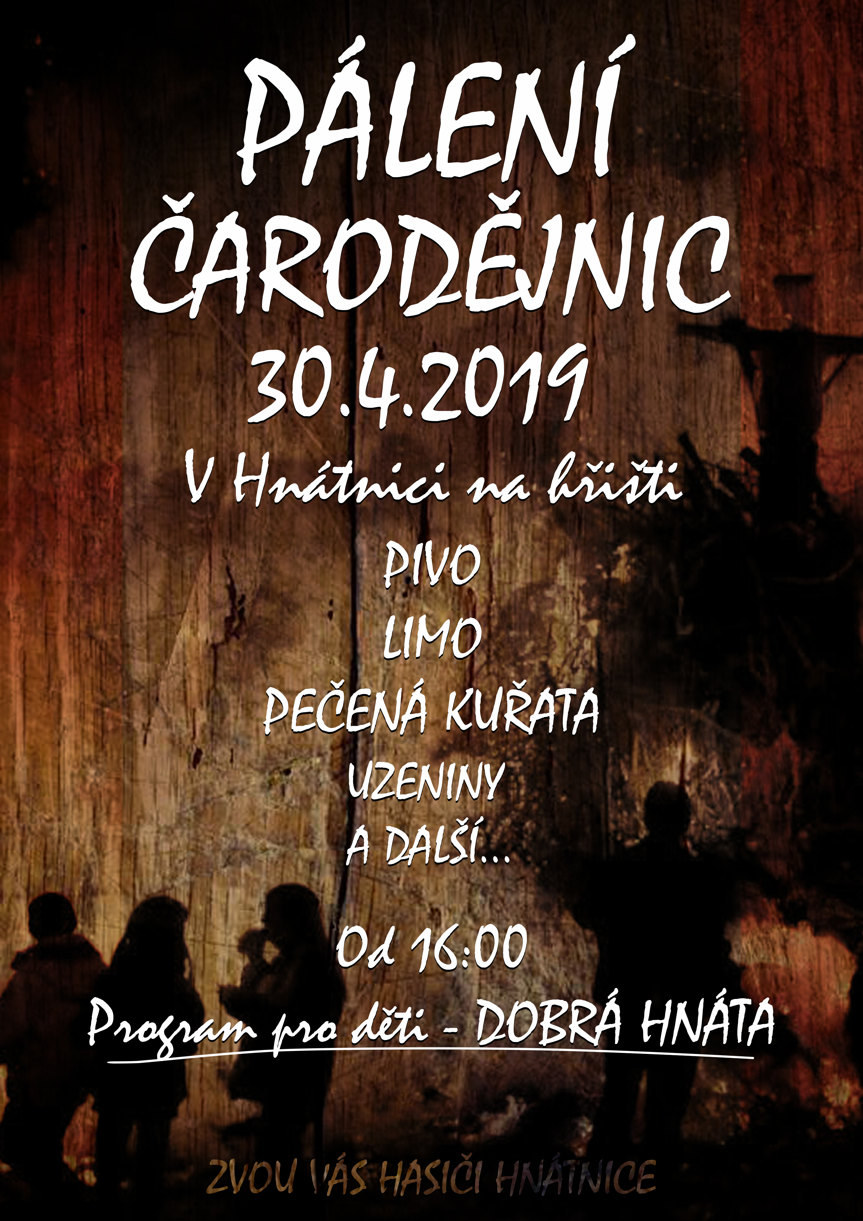 V úterý 30.dubna Vás zveme na tradiční Pálení čarodějnic na hřiště za školkou. Od 16 hodin budou připraveny aktivity pro děti, v 19 hodin vzplane hranice. Připravena budou opečená kuřata, uzenina, pivo, víno, lihoviny i nealko. Přijďte se pobavit a ohřát k ohni!